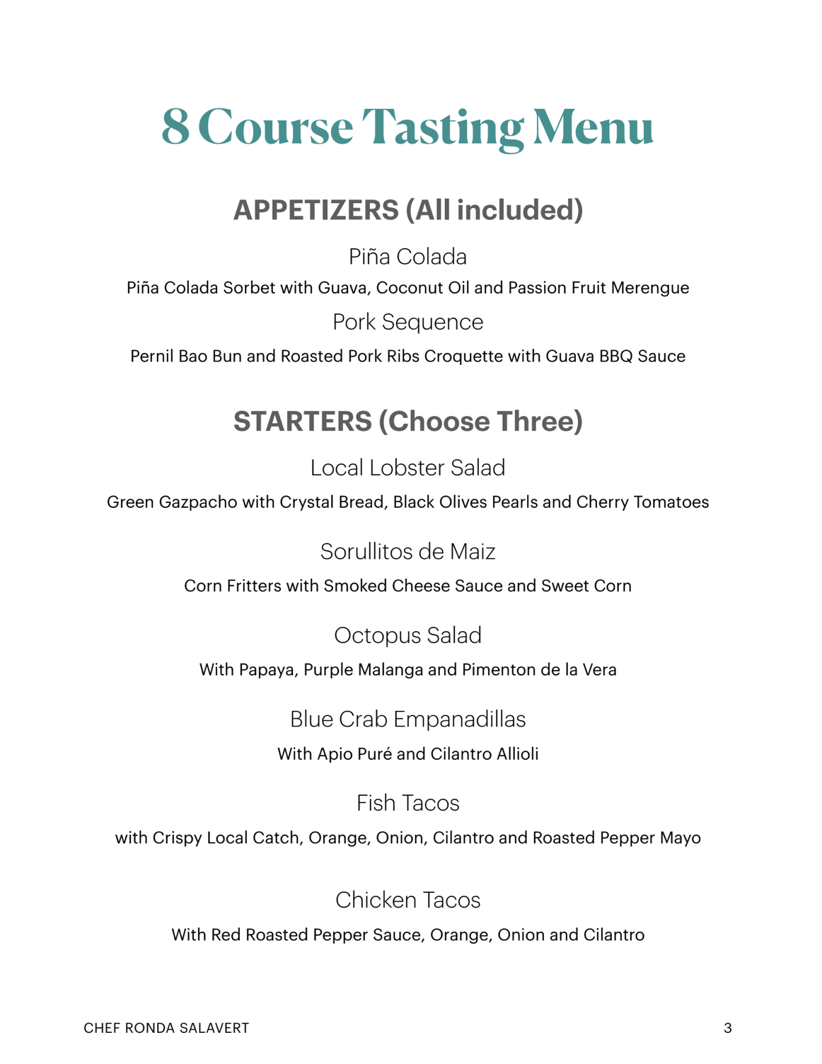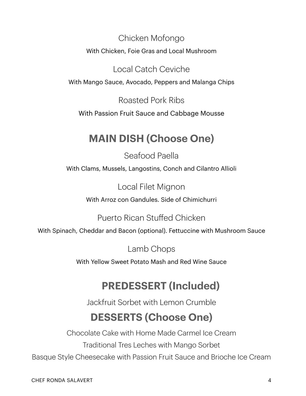Menu listing main dishes, desserts, and other options, including seafood paella, filet mignon, lamb chops, fruit sorbet, chocolate cake, tres leches, Basque cheesecake, and petit fours, authored by Chef Ronda Salaver.