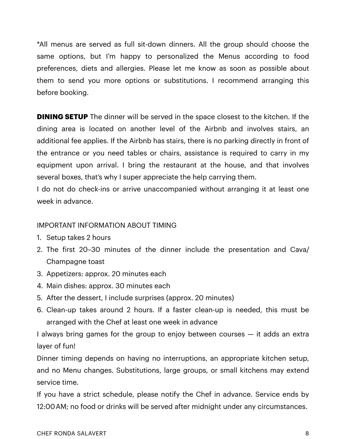 Text document outlining dinner setup, timing, and policies, written by Chef Ronda Salavert.