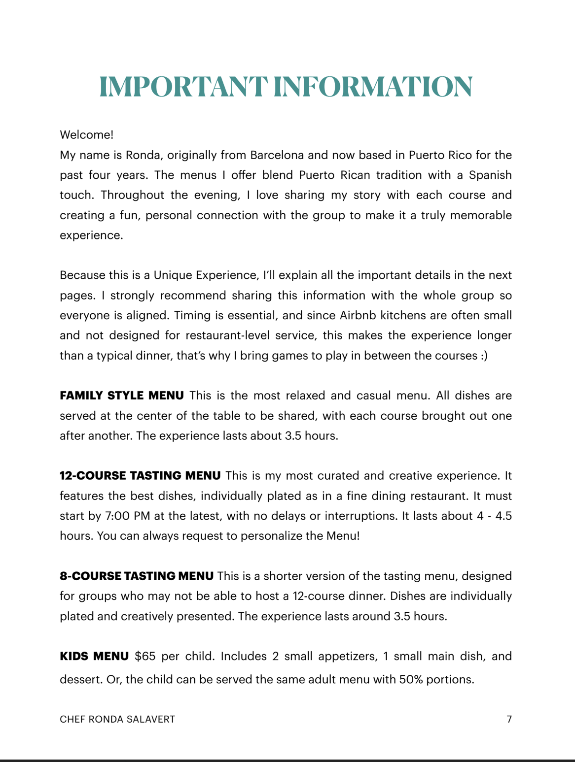 Page with a heading 'IMPORTANT INFORMATION' and text about Chef Ronda, her background, and details about her various tasting menus, including family style, 12-course, 8-course, and kids menu options, with emphasis on a relaxed dining experience.