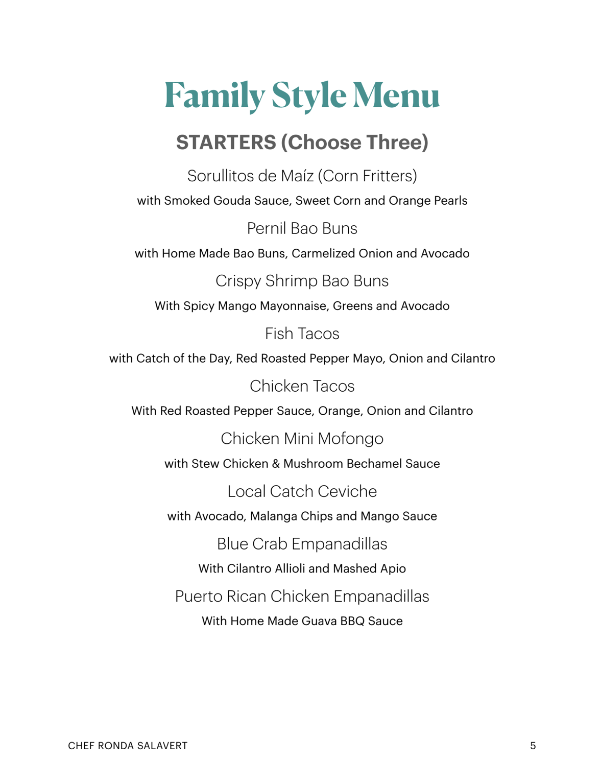 Family style menu featuring starters including corn fritters with smoked gouda sauce, sweet corn, and orange pearls; bao buns with various fillings; fish tacos with catch of the day, red pepper mayo, onion, and cilantro; chicken tacos with red pepper