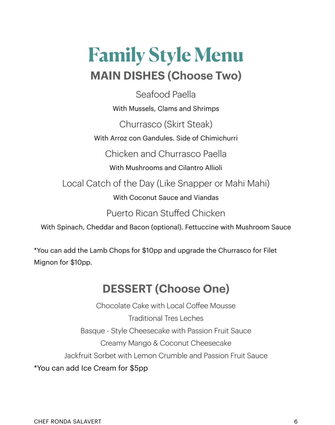 Family style menu listing main dishes and desserts, including seafood paella, skirt steak, chicken paella, local catch, Puerto Rican stuffed chicken, and dessert options like chocolate cake, tres leches, cheesecake, mango coconut cheesecake, and sorb